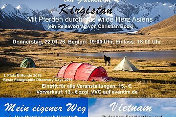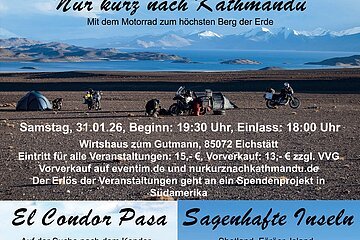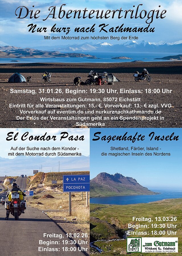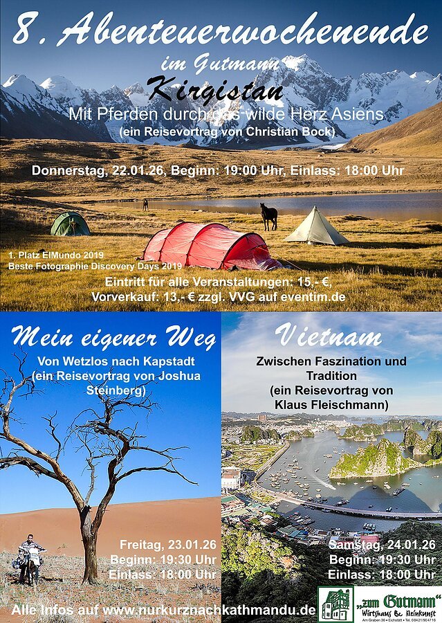 Es gibt mehrere neue spannende Vorträge die im Wirtshaus Zum Gutmann präsentiert werden. "Mein eigener Weg - mit dem Motorrad durch Afrika", Vietnam - zwischen Faszination und Tradition, "Kirgistan - Mit Pferden durch das wilde Herz Asiens", "Nur kurz nach Kathmandu - Mit dem Motorrad zum höchsten Berg der Erde, "El Condor Pasa - Auf der Suche nach dem Kondor mit dem Motorrad durch Südamerika" und "Sagenhafte Inseln - Shetland, Färöer, Island die magischen Inseln des Nordens"
