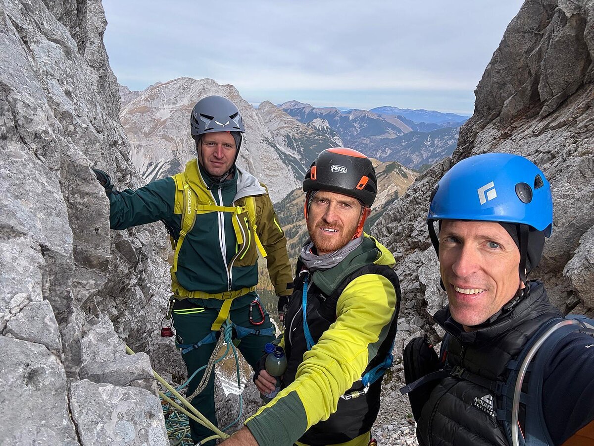 Am nächsten Morgen führte uns ein halbstündiger Zustieg im Sonnenschein zum Einstieg des Nordostgrats. Obwohl die Temperaturen zunächst nur knapp über dem Gefrierpunkt lagen, war es dank Sonne und Windstille überraschend angenehm. Gleich zu Beginn wartete die Schlüsselstelle der Tour: eine kurze, glatte Platte im Grad IV+. Danach folgten zwölf abwechslungsreiche Seillängen über einfachere Platten, Risse und durch einen Kamin – wunderschöne, technisch leichte Kletterei mit immer wieder atemberaubenden Ausblicken ins Karwendel und hinab ins Tal. Abschnittsweise kletterten wir gemeinsam mit unseren neuen Bekannten von der Schwazer Bergwacht, was unserem Vorsteiger Andi die Routenfindung etwas erleichterte. Vom Vorgipfel führte uns schließlich ein kurzes Stück ungesichertes Gelände im ersten bis zweiten Schwierigkeitsgrad zum Hauptgipfel, wo uns ein phantastischer Rundblick für alle Mühen belohnte.