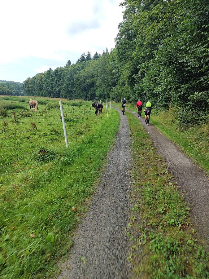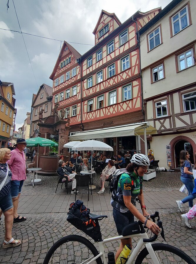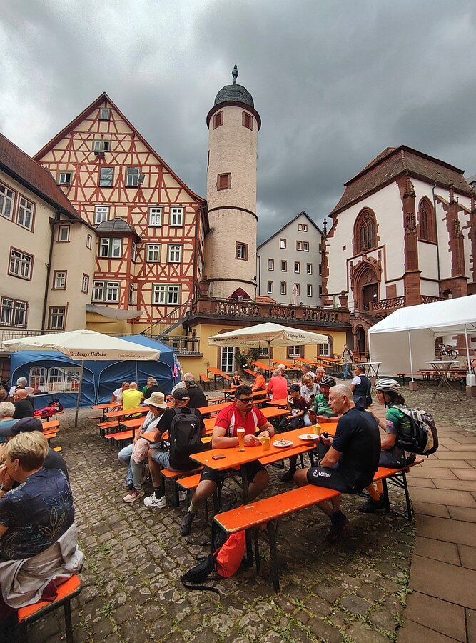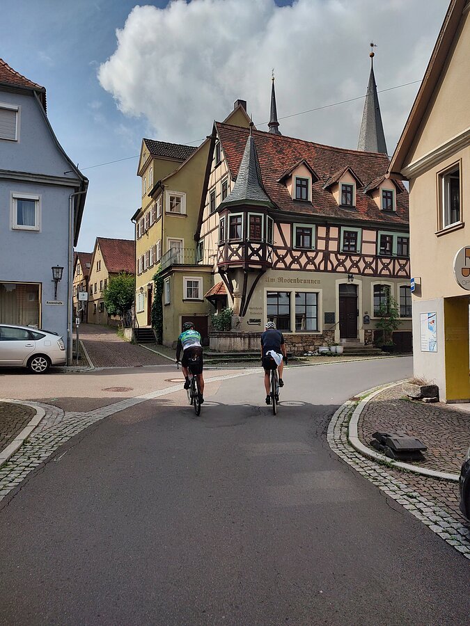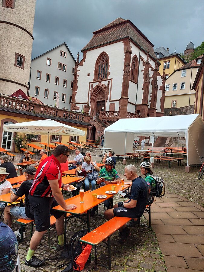Ab Wertheim verließen wir das Taubertal und fuhren über das Aalbachtal in Richtung Würzburg. Die Landschaft öffnete sich, Weinberge und spürbare Anstiege bestimmten nun das Bild. Die Kombination aus Tauber- und Aalbachtal sowie den Ausläufern der Fränkische Alb machte die Strecke landschaftlich besonders reizvoll und sportlich anspruchsvoll. Rund 145 Kilometer und etwa 900 Höhenmeter standen am Ende auf dem Tacho – eine starke Leistung, die unsere bunte Truppe gemeinsam souverän meisterte.