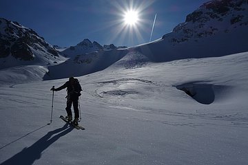 Tag 4: Am Abreisetagtag, abermals bei strahlend blauem Himmel, wollten wir wieder die Chalausköpfe ansteuern. Nun aber direkt von der Hütte über das Steinmandl zum Chalausferner und von der östlichen Seite hinauf. Pfeifender, eisiger Wind und die Wegführung, relativ lange im Morgen-Schatten, boten beinahe „winterliche” Bedingungen. Erst im Gipfelhang begrüßte uns wieder die Frühjahrssonne. Dadurch bedingt bot nur der erste Teil der Abfahrt tiefschneeähnliche Bedingungen, die dann schnell in eine komplette eisige Oberflächenversiegelung übergingen. Zurück an der Jamtalhütte luden wir unser Übernachtungsgepäck in die Rücksäcke und ließen uns den langen Ziehweg hinunter nach Galtür, zum Parkplatz gleiten. Vier herrliche Silvretta-Tage waren, leider viel zu schnell, zu Ende.
