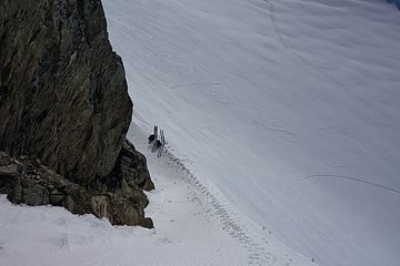 Tag 3: Am Sonntag wählten wir die Chalaus-Köpfe als Tagesziel, die wir über den Jamtalferner vom Westen aus bestiegen. Sonne pur machte das Vorhaben zur schweißtreibenden Tätigkeit. Vom Skidepot aus kletterten wir steil hinauf zur nördlichen Spitze. Die Abfahrt über den Aufstiegsweg war perfekt „getimed”, die Sonne hatte Eis und Harsch der passenden thermischen Reifung unterzogen.