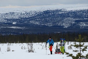 Elf Tage vorher. Nach einem knappen Tag Fahrt mit Auto, Bus, Zug und Flugzeug sitzen wir am Straßenrand eines Skizentrums bei Sälen in Mittelschweden beim Verteilen des Gepäcks auf die beiden Pulkas (Expeditionsschlitten) und Rucksäcke. Insgesamt sind es rund 140 kg Gewicht, wovon 50 kg allein auf das Essen für vier Personen – Benedikt, Katja, Samira und mich – für die nächsten zwei Wochen entfallen. Gegen Mitternacht geht es mit Stirnlampen schließlich los bergauf ins Fjäll, in die baumlose Weite der schwedischen Bergregion. Die Entscheidung Backcountry-Ski anstatt Schneeschuhe mitzunehmen fällt alsbald äußerst positiv aus. Selbst ohne große Langlauferfahrung kommen wir recht zügig voran. Die erste Ernüchterung lässt allerdings nicht lange auf sich warten. Flüssiges Wasser gibt es auf der Hochebene nicht. Schneeschmelzen ist durchaus möglich, trotz sehr guter Sturmkocher auf Grund der Temperaturen von etwa -5 °C und ordentlichem Windchill allerdings nur unter enormen Benzinverbrauch. Grob überschlagen reichen unsere rund 2,7 l für weitere vier Tage. An neuen Brennstoff kommen wir erst wieder in Flötningen, in etwa acht Tagen und 140 km. Logische Konsequenz: kaum Trinkwasser, kein warmes Essen. Trinkwasser, was nachts nicht im Schlafsack liegt, wird gefrieren.