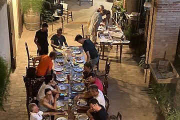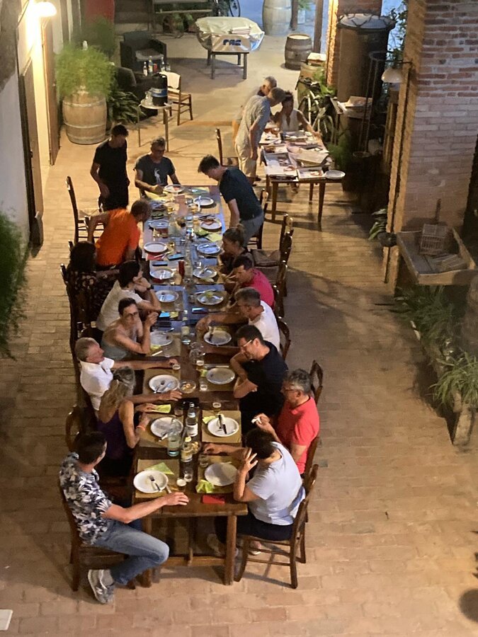 Als Highlight kann man die Mittagspause im Hinterhof einer Metzgerei bezeichnen, die ein kleines Restaurant betrieb. In dem Dorf war nichts los, es glich einer verlassenen Westernstadt in der Prärie. Nur dort regte sich etwas. Ehe wir noch diskutierten, ob es aufgrund der langen Wartezeit sinnvoll sei, für so viele Leute Nudeln zu bestellen, oder ob es nicht schneller ginge, nur kurz ein Panino, ein belegtes Brötchen, zu essen, wurden die Nudeln schon serviert – und die Panini-Fraktion musste sehr zur Freude der Spaghetti-Esser warten. In Italien ist Pasta ein Nationalgericht und immer sofort verfügbar.