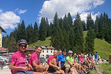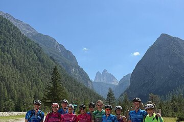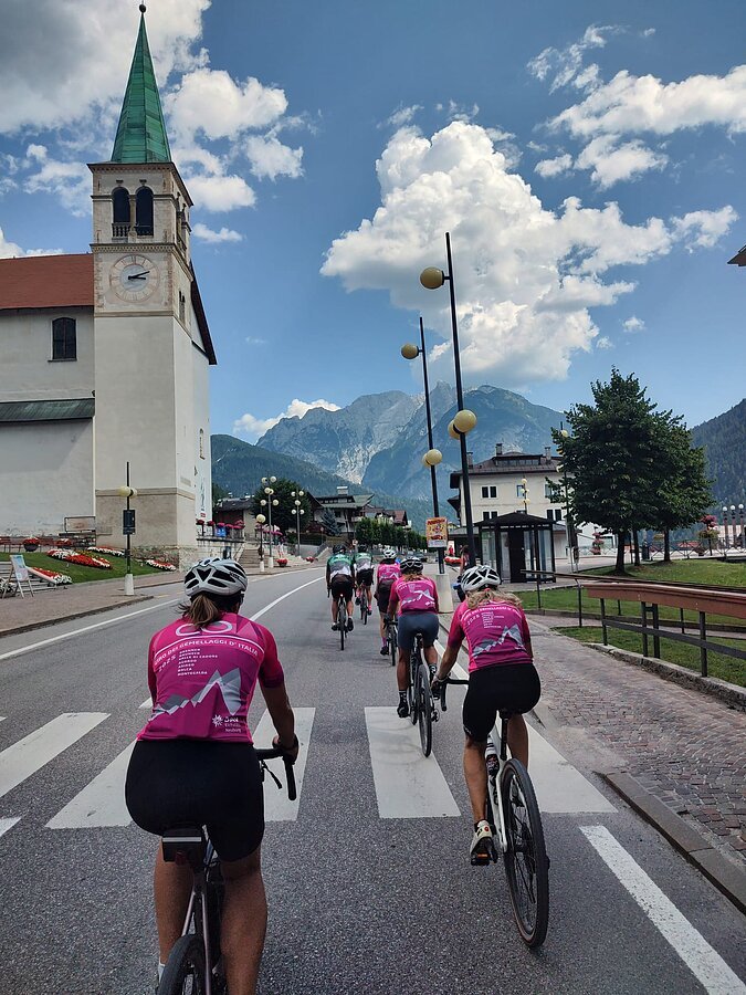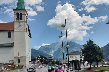 Als kurz und knackig oder Sprintetappe könnte man die heutige Fahrt durch die Dolomiten bezeichnen. Wenig Kilometer, viele Höhenmeter. Erneut eine Etappe durch die Felszacken der Belluneser Dolomiten. Antelao, Monte Pelmo, Civetta und noch viele weitere dieser bizarren Kalkfelsen säumten unseren Weg. Treten, Schwitzen, Staunen – auf diese drei Worte könnte man diesen Abschnitt reduzieren. Die beiden Anstiege mit jeweils 750 Hm und einer durchschnittlichen Steigung von 9 % hinterließen ihre Spuren. Der guten Laune tat das aber keinen Abbruch. Morgen steht die Königsetappe an, ein Ritt über drei Pässe.
