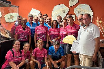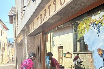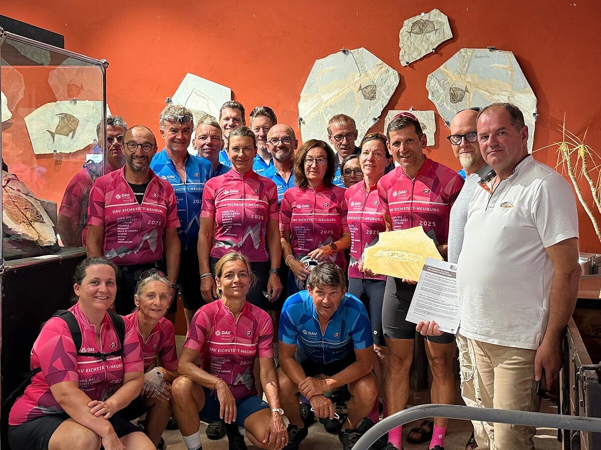 Den Besuch unserer Partnerstadt mussten wir uns mit einigen Schweißperlen hart erarbeiten. Leichter Anfang, schweres Ende. Zunächst ging es 800 Hm vom Hochplateau von Asiago hinunter nach Schio, ehe drei Anstiege mit je 500 Hm folgten. Teilweise wiesen diese Steigungsprozente von 18 % auf – und das über längere Abschnitte. Die Leiden waren schnell vergessen, als wir Bolca erreichten und von Filippo herzlich empfangen wurden. Zum Abendessen kam Stefano Presa, der Bürgermeister. Mit bayerischer Musik aus dem Handy zapften wir ein Fass Eichstätter Bier und übergaben im Namen der Stadt Eichstätt eine originale Versteinerung eines Tintenfisches mit der Bitte, diesen zusammen mit einem Schreiben, das auf die Partnerschaft hinweist und diese weiter bekräftigt, im Museum aufzuhängen. Sichtlich gerührt nahm Herr Presa dieses Geschenk an und organisierte umgehend einen Übergabetermin am Folgetag im Museum. Als Dank und Anerkennung erhielten wir ein Wappen der Gemeinde und ließen den Abend gemütlich beim Essen ausklingen.