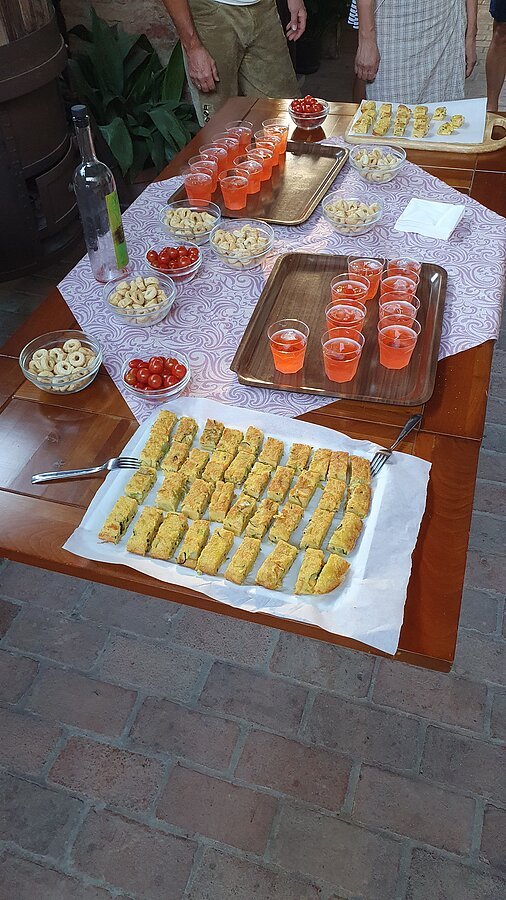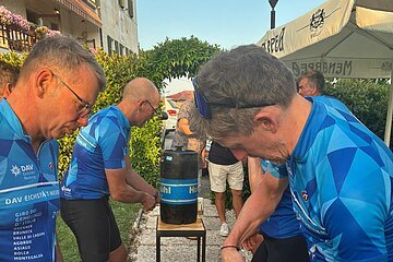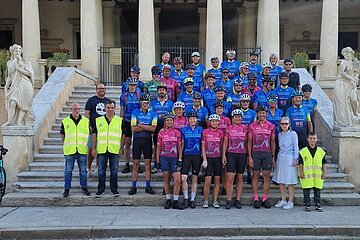 Gleich um 08:00 Uhr in der Früh stand eine 65 km lange Ausfahrt mit der Radgruppe aus Montegalda auf dem Programm. Wir staunten nicht schlecht, als dort unzählige Radler und Radlerinnen standen. Drei Begleitmotorräder sicherten das Peloton mit mehr als 50 Radlern auf dem Weg durch die Euganeischen Hügel mit den bekannten Orten Arquà Petrarca (einer der schönsten Orte Italiens) und Este (eine der ältesten Städte Venetiens) ab. Ein Espressostopp gehörte selbstverständlich dazu. Wieder zurück in Montegalda folgte ein Mittagessen mit Vorspeise, gegrillten Köstlichkeiten und einer riesigen Torte als Dessert. Zum Löschen des Durstes diente Eichstätter Bier. Danach wurde es offiziell: Wir übergaben im Namen der Stadt Eichstätt ein Replikat eines Pfeilschwanzkrebses, der für Beständigkeit und Anpassungsfähigkeit steht – Eigenschaften, die auch für diese Städtefreundschaft mit Montegalda gelten sollen. Mit der Radgruppe wurde ein Gegenbesuch im nächsten Jahr zum Volksfest ausgehandelt. Dieser Besuch in Montegalda wird uns und den Leuten dort noch lange in Erinnerung bleiben.