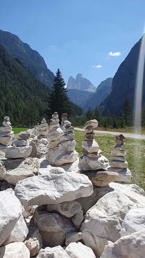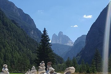 Dieser Abschnitt stand im Zeichen der Drei Zinnen. Sie waren unser ständiger Begleiter. Das bekannte Bild dieser Bergformation kennt jeder, doch wenn man sie von der anderen Seite betrachtet, würde man ein Hinweisschild benötigen, um zu wissen, dass es sich bei den Felszacken um das Weltkulturerbe handelt. Der Misurinasee bildete heute den Höhepunkt der Fahrt durch die Dolomiten – ein landschaftliches Spektakel. Gekrönt wurde es von einem Bad im türkisblauen und kalten Lago di Caterina mit Blick, wie könnte es anders sein, auf die Drei Zinnen.