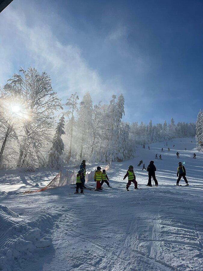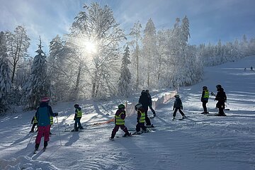 Aber nicht nur die Kinder hatten ihren Spaß. Auch die Erwachsenen konnten die sanften Hügel des Hohen Bogens genießen – ganz entspannt und ohne „Gepäck zwischen den Beinen“ ging es hinunter, während sich die fleißigen Skilehrer mit dem Nachwuchs ins Zeug legten.