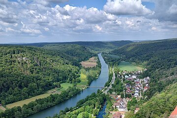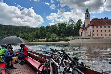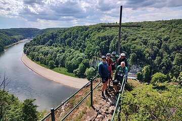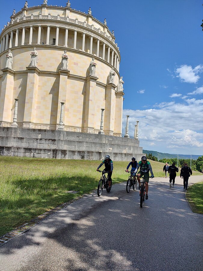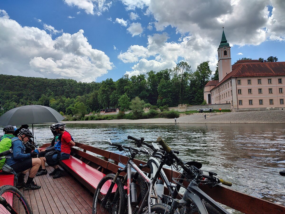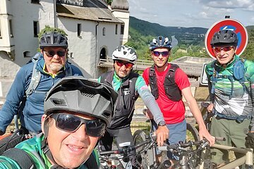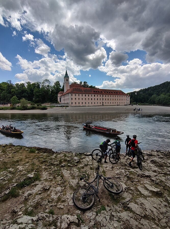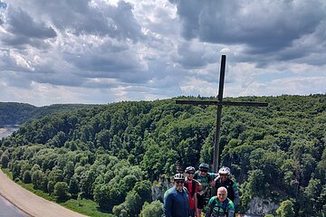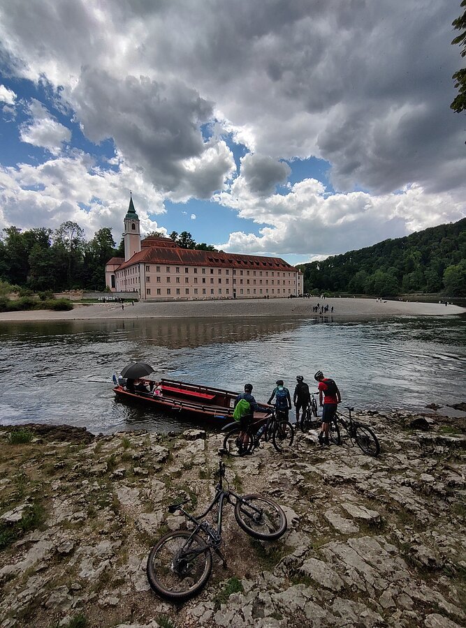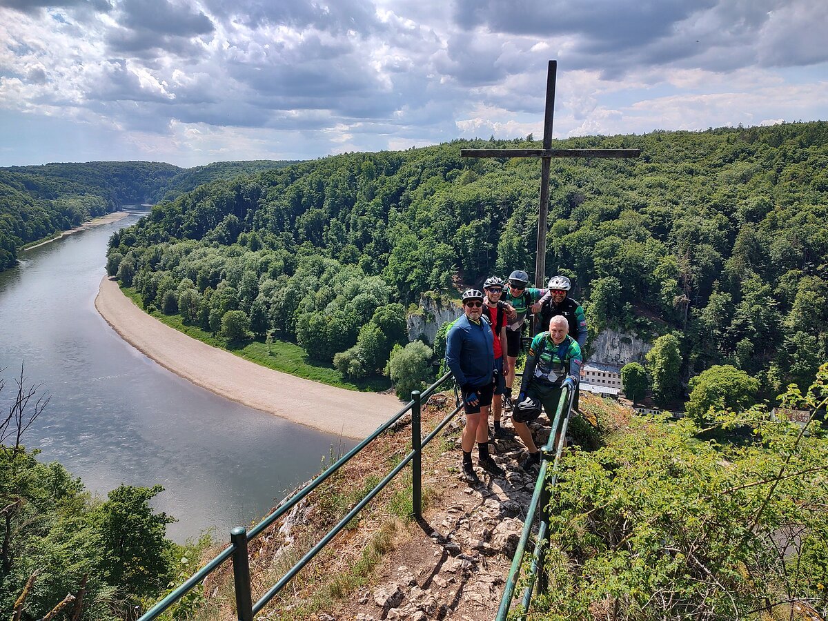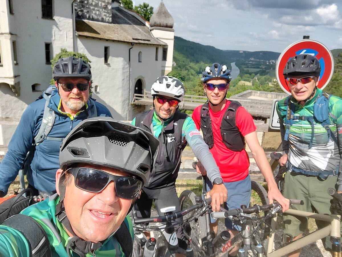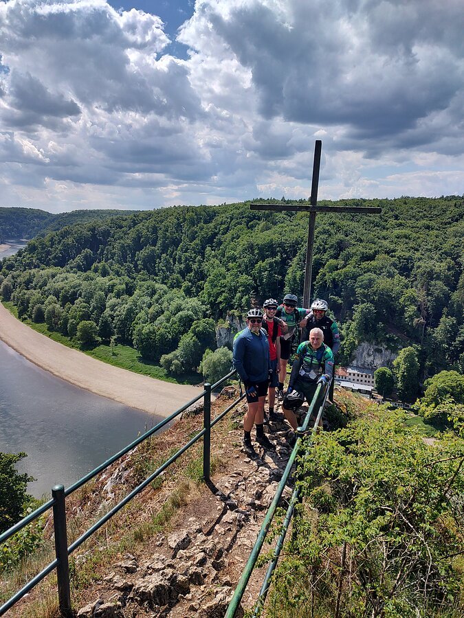 Unsere Tour startete an der Burg Prunn, die eindrucksvoll über dem Altmühltal thront. In der frischen Morgenluft machten wir uns auf den Weg und folgten schmalen Trails zu einer beeindruckenden Höhle mit weitem Blick ins Donautal, bevor wir weiter zur hoch über dem Tal gelegenen Burg Randeck radelten. Nach einer kurzen Pause führte uns die Strecke zum Aussichtspunkt Maria Fels, von dem aus wir einen herrlichen Blick auf Kelheim und die imposante Befreiungshalle genießen konnten. Gestärkt durch ein Mittagessen im Schneider Bräu nahmen wir den Panoramaweg hinauf zur Befreiungshalle in Angriff und wurden mit grandiosen Ausblicken belohnt. Anschließend führte uns der Weg durch ruhige Wälder zum Kloster Weltenburg, wo wir mit einer kleinen Zille die Donau überquerten und im Biergarten eine wohlverdiente Pause einlegten. Der letzte Abschnitt führte uns schließlich auf der Nordseite der Donau zurück Richtung Kelheim; am Aussichtspunkt Wieserkreuz bot sich noch einmal eine beeindruckende Sicht auf das Klösterle und den Donaudurchbruch. Bei perfektem Radlwetter – sonnig, angenehm temperiert und mit leichter Brise – erlebten wir eine abwechslungsreiche Mountainbike-Tour voller sportlicher Herausforderungen, eindrucksvoller Natur und kultureller Highlights.
