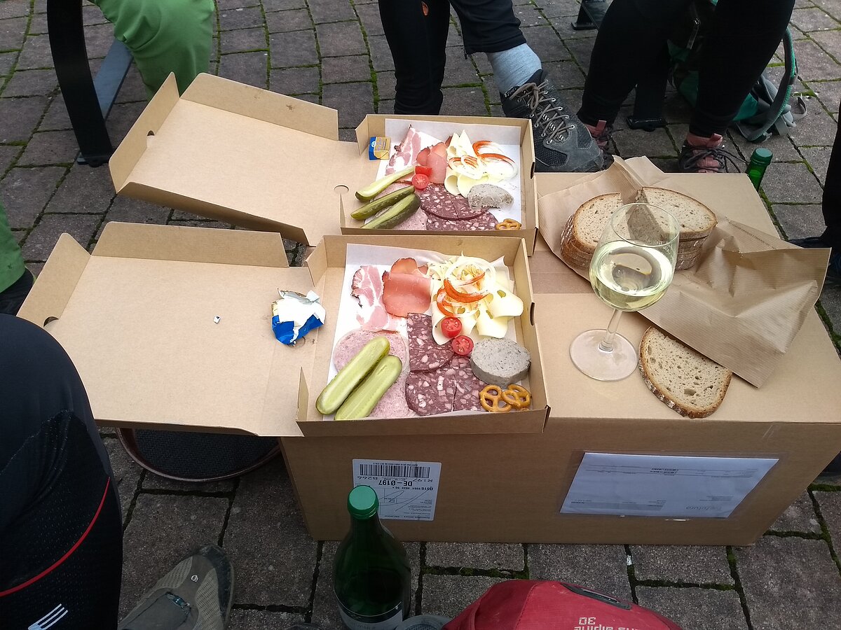 Hier konnten wir uns mit Wein und Hecker Brotzeit in den Hof setzen und uns nach dem „langen“ Zwischenabschnitt erstmal stärken und unsere Rucksäcke mit besten Frankenwein füllen. Danach sind wir weiter Richtung Würzburg gefahren, hinauf zur Festung Marienberg