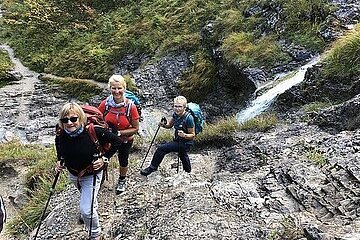 Unsere abwechslungsreiche Wanderung durch die traumhafte Herbstlandschaft von Wildbad Kreuth, vorbei an der malerisch gelegenen Siebenhüttenalm führte uns zuerst zur kleinen Wolfsschlucht. Nach diesem Abstecher erreichten wir wenig später die große Wolfsschlucht. Über den steilen, teilweise ausgesetzten Steig, der abschnittweise seilversichert ist, haben wir sehr schnell an Höhe gewonnen. Nach dem Steig ging es wieder gemütlich weiter. Beim Abstecher zum Schildenstein (1613 m) wurde es noch einmal kurz steil und ausgesetzt. Oben am Gipfel konnten wir die traumhafte Rundumsicht bei Brotzeit bis zum Achensee genießen. Der weitere Weg bergab führte uns vorbei an der Königsalm, die das letzte Wochenende vor der Winterpause geöffnet hatte. In der Sonne sitzend konnten wir die gute Auswahl an hausgemachten, köstlichen Kuchen genießen. Frisch gestärkt war das letzte Stück des Abstiegs zügig bewältigt. Am Schluss, bedingt durch einen falschen Abzweig, gab es noch ein erfrischendes Fußbad durch den Bach, denn zurück wollte keiner mehr laufen. Wir durften einen perfekten, angenehm warmen, sonnigen Herbsttag bei bester Stimmung in wunderschöner Landschaft genießen.